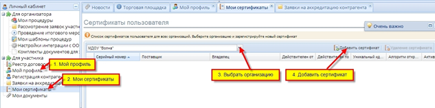 4.2.1.1.     необходимо открыть пункт меню «Профиль» затем пункт меню « Мои сертификаты ».