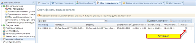 4.2.1.6.    После принятия оператором ЭТП положительного решения в строке где указан Ваш сертификат в столбце «Активный» появится  признак, что он  активирован.
