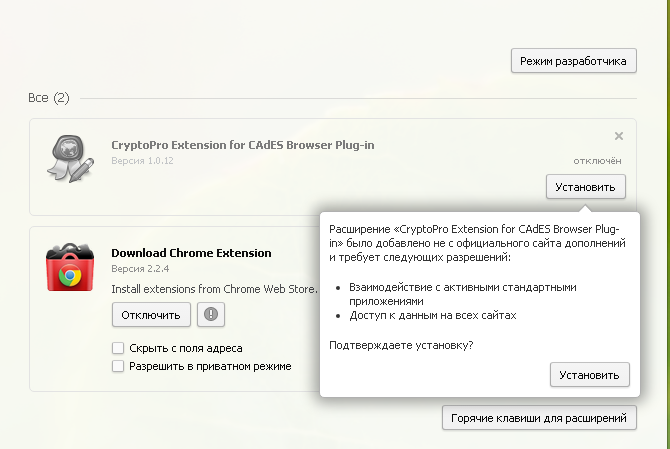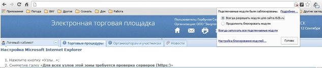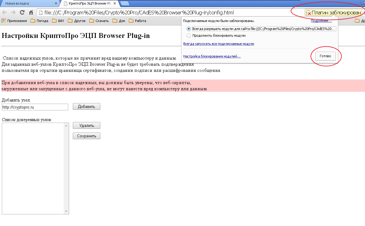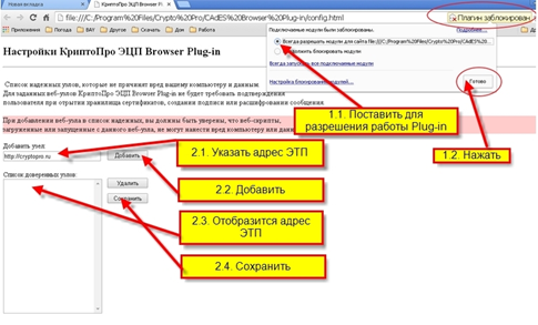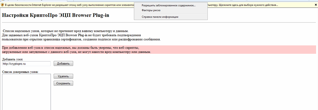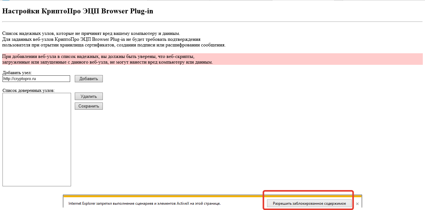 Обратите внимание ! при первом запуске страницы в браузере используемый на странице Plug-in блокируется , для работы страницы необходимо разрешить работу Plug-in После разрешения работы Plug-in , в поле Добавить узел пишется адрес площадки , нажать кнопку Добавить, адрес должен появится в списке доверенных узлов. и нажать кнопку Сохранить изменения.