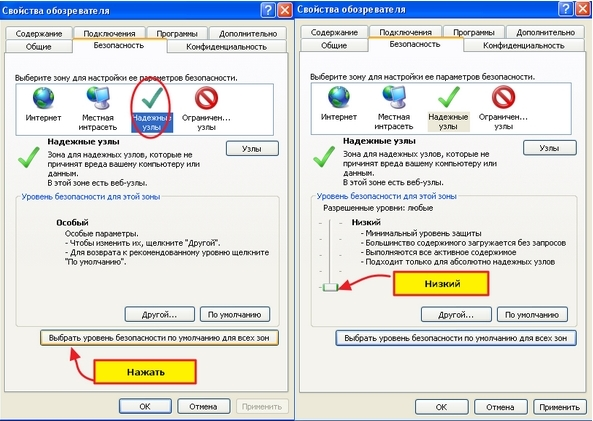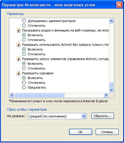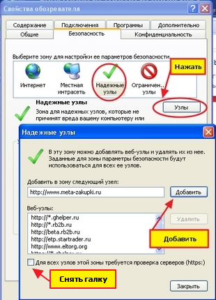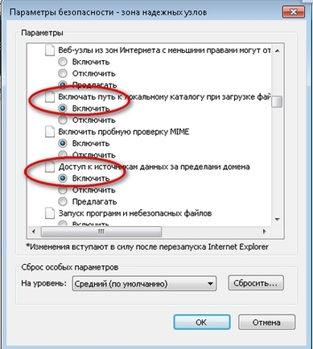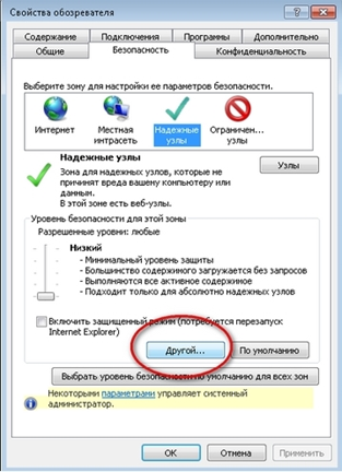• Выберите в верхнем меню пункт «Cервис», затем «Свойства обозревателя». В появившемся окне выберите вкладку «Безопасность». Выберите «Надежные узлы». • Нажимаем "Другой". И далее включаем настройки "Включать путь к локальному каталогу при загрузке файлов" и "Доступ к источникам данных за пределами домена". • Проверьте ещё раз возможность подписи файла на странице проверки ЭП. • Проверьте настройки , и, в случае необходимости настройте элементы ActiveX. Для этого установите флажок в положение "Включить" на всех настройках ActiveX.